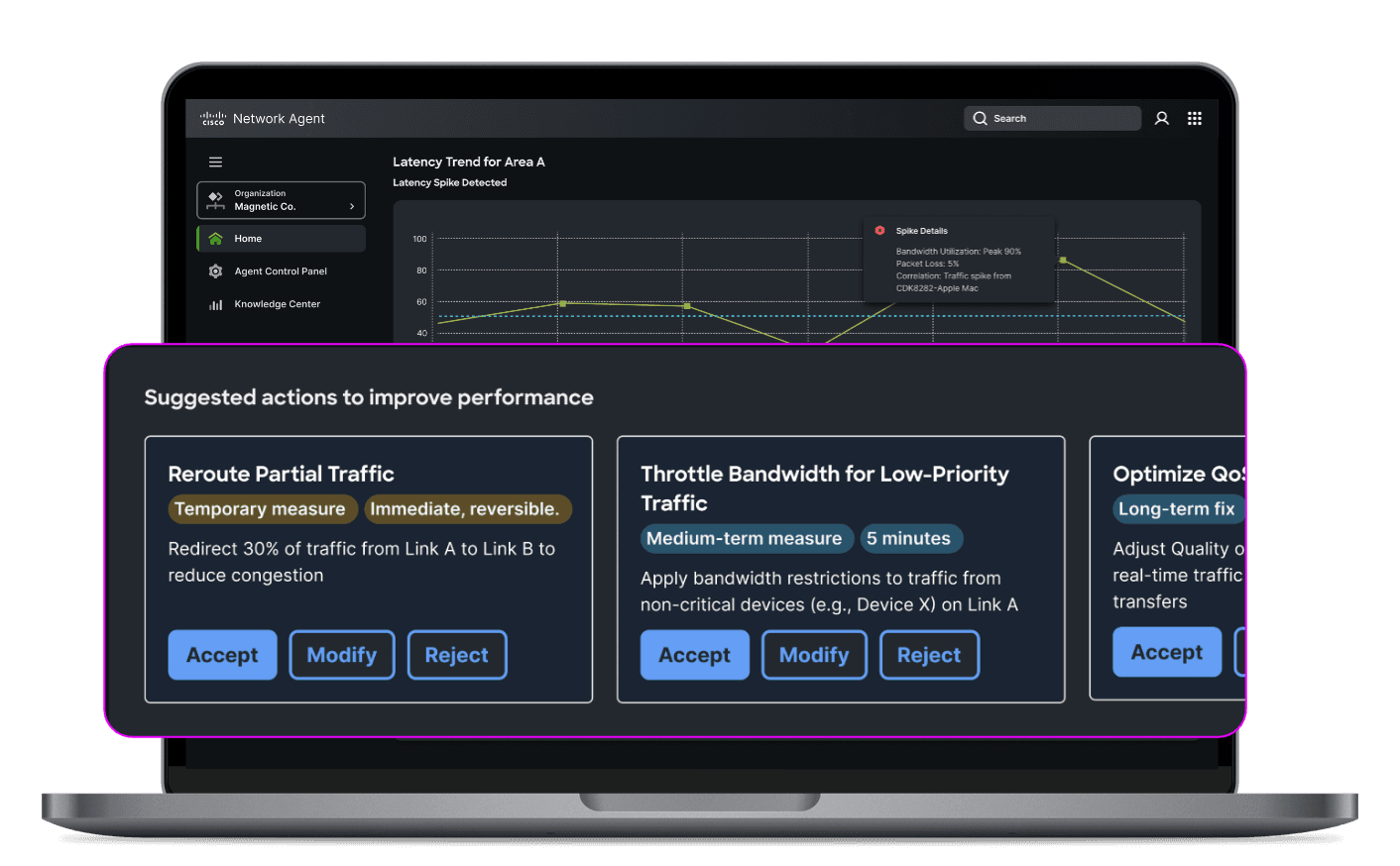 See agent actions in context and observe agent performance in network improvement.
